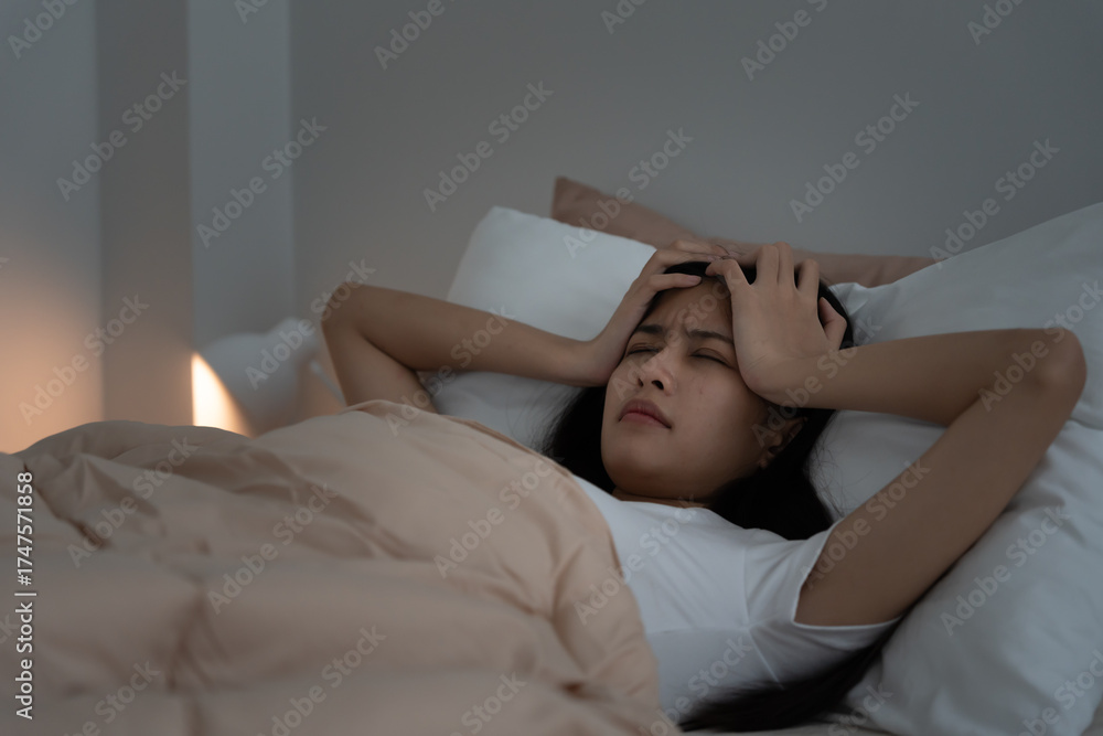 asian woman in bed late trying to sleep suffering insomnia, sleepless or scared in a nightmare, looking sad worried and stressed. Tired and headache or migraine waking up in the middle of the night.