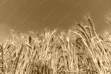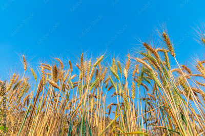 Golden wheat field with blue sky background, close up of ripe wheat ears in sunny day, concept of agriculture, organic farming, and natural harvest season.