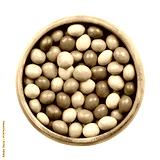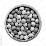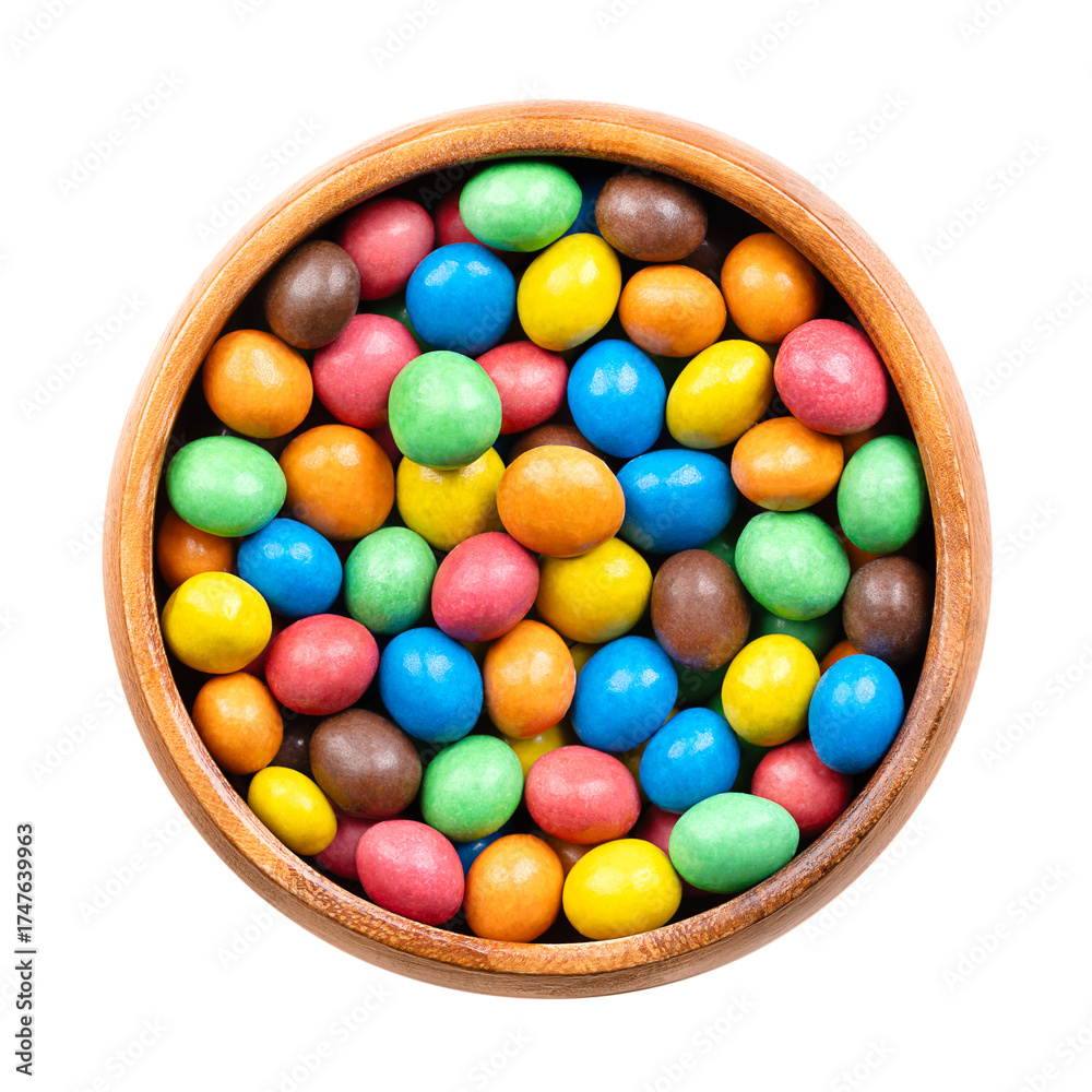 Colorful sugar-coated chocolate dragees, in a wooden bowl. Dragee chocolate confectionery consisting of a multi colored candy shell surrounding a chocolate filling. Isolated close-up from above. Photo