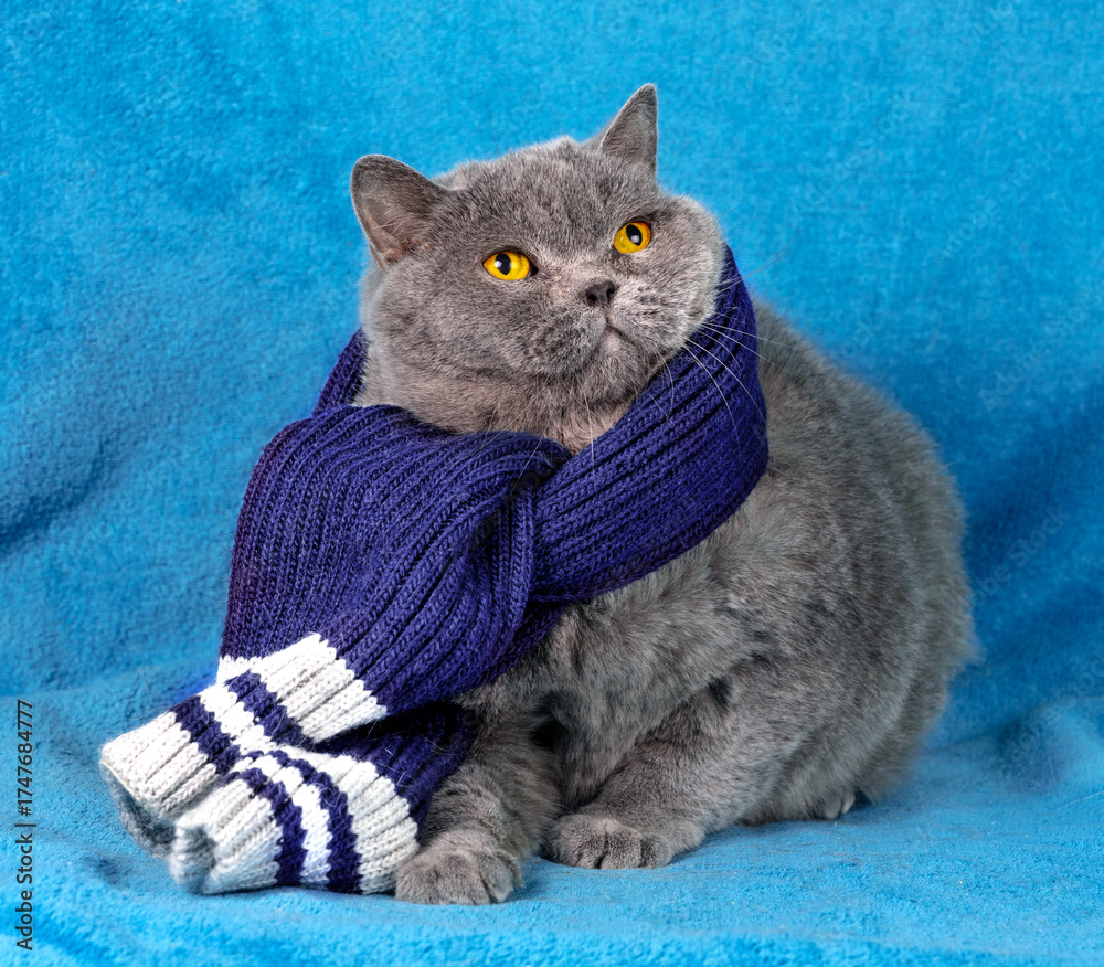 A charming blue British Shorthair cat wearing a warm scarf against a blue background. Winter concept