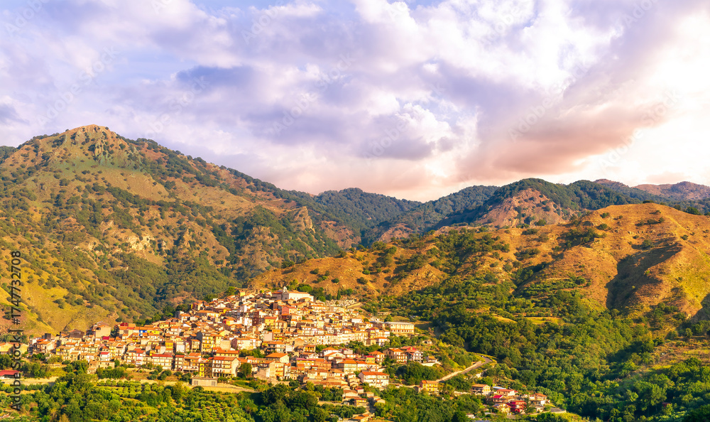 highland landscape of italian town between amazing green mountains with scenic sunset cloudy sky on background