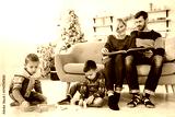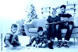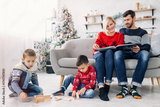 Happy family on the couch near the Christmas tree. Cozy family atmosphere for Christmas. Children play with wooden blocks, while parents read an interesting book.