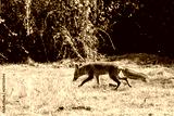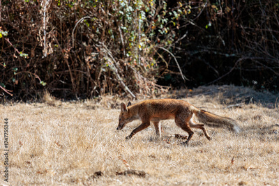 Vulpes vulpes. Common or red fox walking through the meadow.
