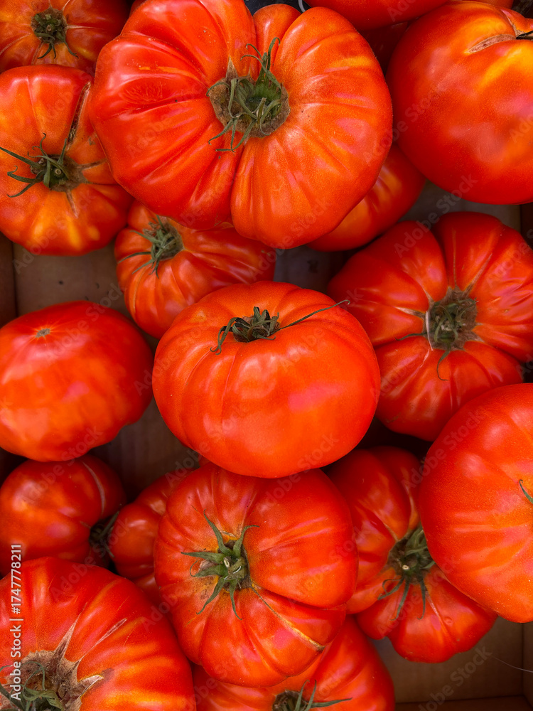 Red tomatoes at a farmer's market. Close-up. Top view.