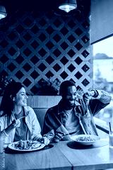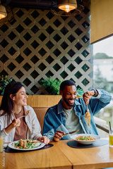 Happy diverse couple eating pasta and fresh salad, sharing a laugh during a casual lunch at a modern restaurant