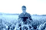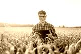A young farmer in a checkered shirt with a digital tablet works in a field. An agronomist checks the quality and growth of the crop at sunset. Gardening concept, harvesting.