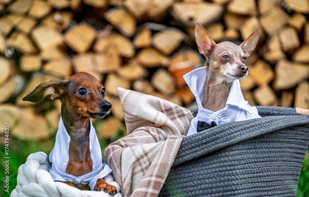Two cute dogs in elegant white shirts sitting in baskets, adorable puppy couple dressed for wedding party, formal pet fashion and friendship concept