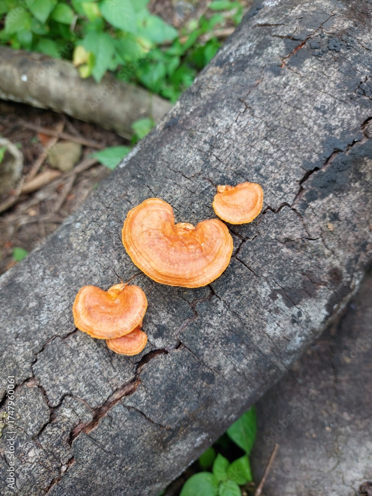 Close-up of orange lingzhi mushrooms (Ganoderma lucidum) growing on a decaying tree trunk in a tropical forest. Wild medicinal fungi with beautiful natural texture and vibrant color,