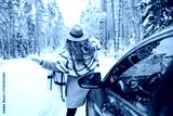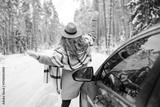 A young woman in a warm coat and a bright scarf stands next to a car in a snowy forest. A smiling woman enjoys a winter car trip on a sunny day. Concept of travel, leisure, and transportation.