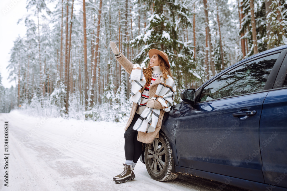 A young woman in a warm coat and a bright scarf stands next to a car in a snowy forest. A smiling woman enjoys a winter car trip on a sunny day. Concept of travel, leisure, and transportation.