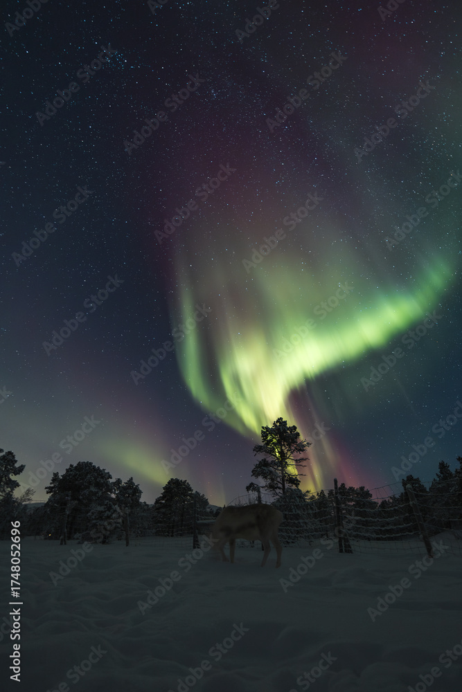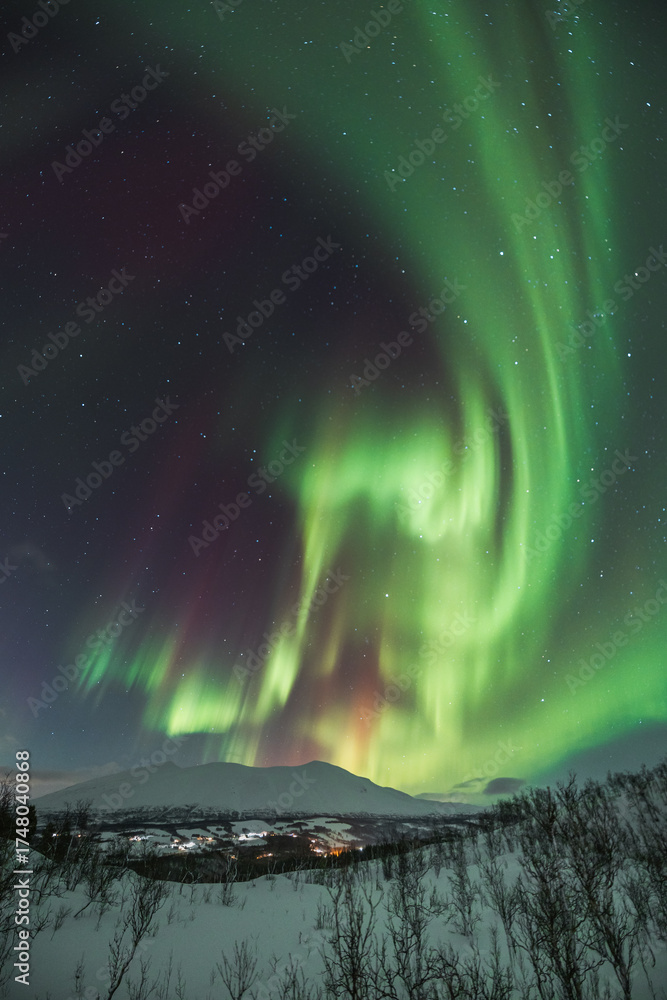 Magical Aurora Borealis in green, red, pink colours above Mortenhals with thousands of stars in the Troms region of Northern Norway