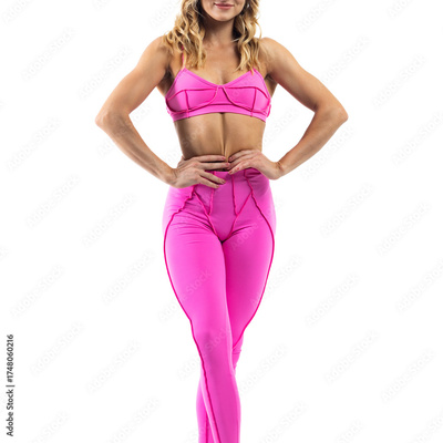 Athletic woman posing in pink sports bra and leggings with transparent background