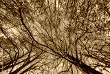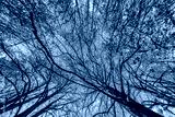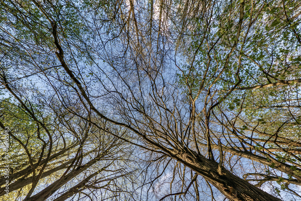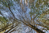 bare crowns and clumsy branches of huge oak trees growing in blue sky in sunny day