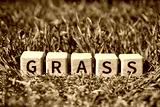Wooden cube blocks with GRASS text on fresh green grass in sunlight
