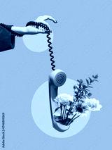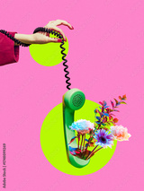 Conceptual collage of hand holding green phone with blooming flowers on pink background. Concept of positive communication, creativity, emotional connection in media, and marketing visuals.