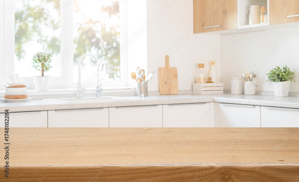 Wooden table top for food presentation with blurred modern kitchen counter interior background