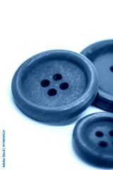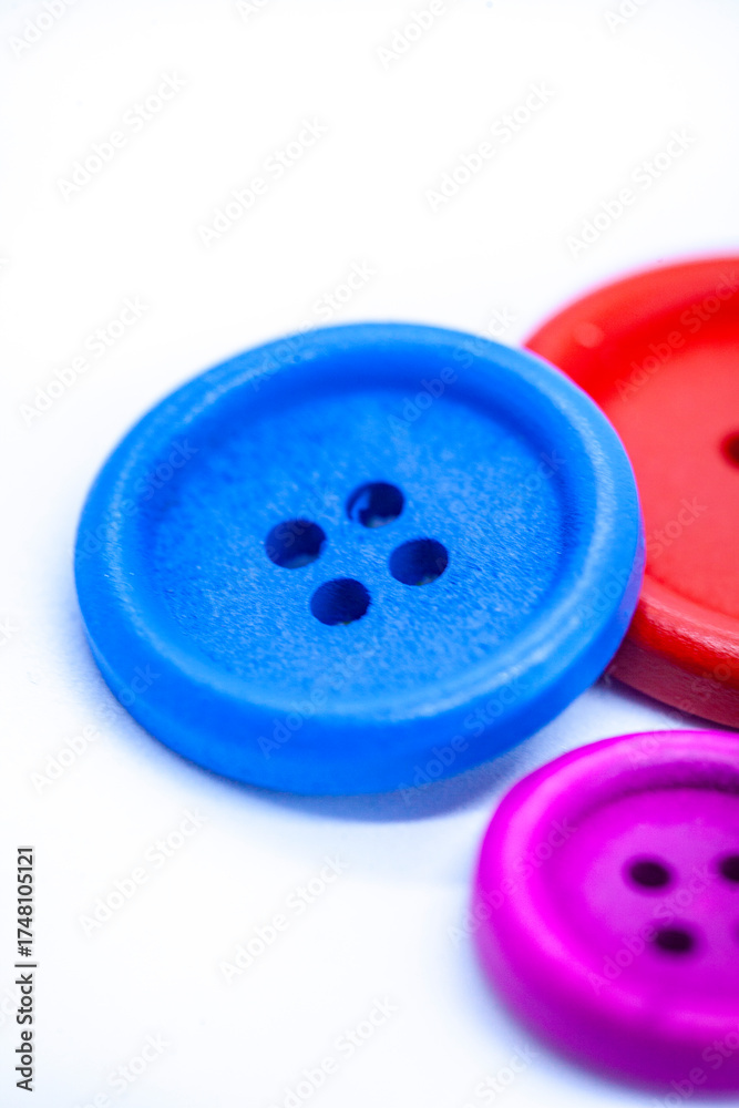 Blue button is surrounded by three other buttons, one of which is red. soft selective focus