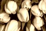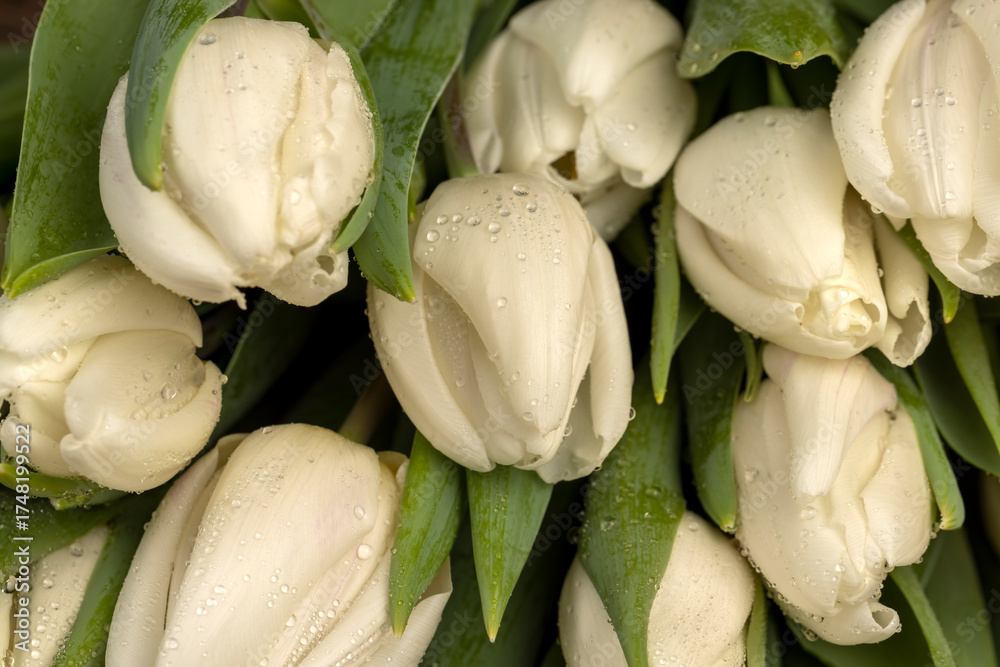 wet beautiful fresh white tulips with green leaves in a large floral bouquet, a large number of beautiful fresh white tulip flowers covered with drops of water in a gift bouquet