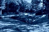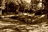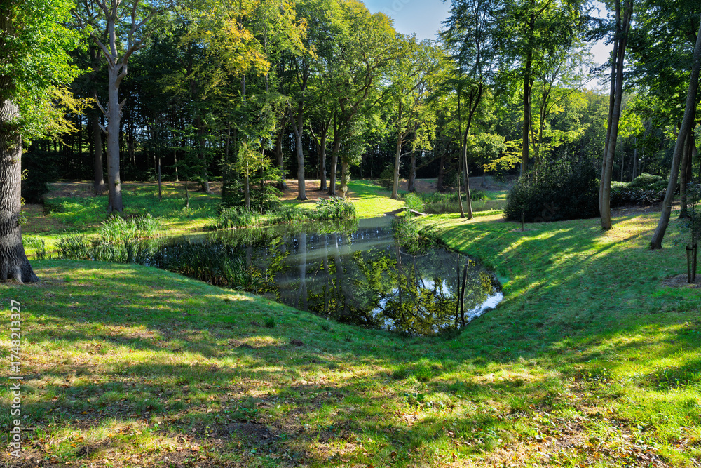 Serene Park Scene With Shade Trees, Open Field, Bench, And Distant Sea Horizon Under Bright Daylight, Palsgaard, Denmark