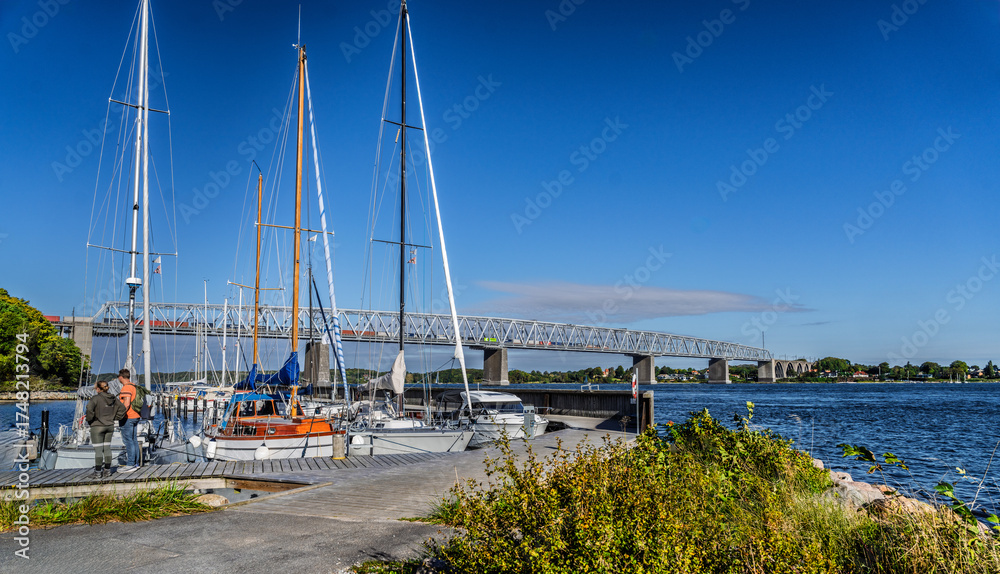 Coastal Waterfront With Sailboat, Bridge, and Calm RFjord Scene Under Clear Blue Sky, Middelfart, Denmark