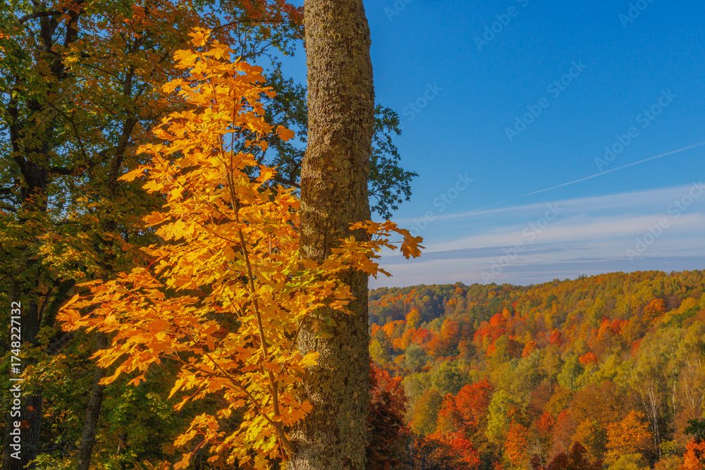 A Stunning Autumn Landscape Featuring Vibrant Trees, Bright Colors, and a Clear Blue Sky