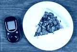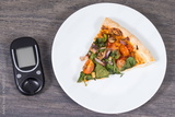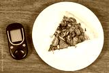 Glucometer using for checking sugar level and fresh baked vegetarian pizza. Nutrition during diabetes