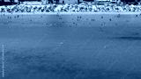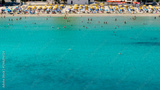 Aerial view of Mondello Beach, located near Palermo, Sicily, Italy. There are many people on holiday in the bay. The Mediterranean Sea is emerald and crystal clear.