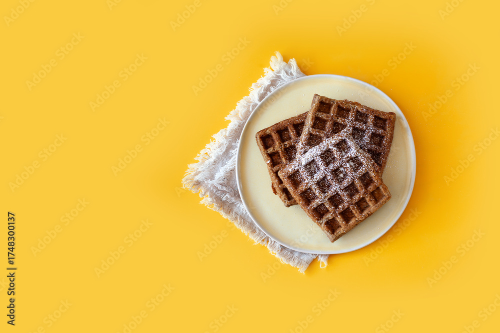 Homemade oat waffles on a white plate on a sunny yellow background copy space