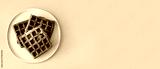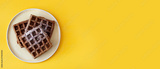 Homemade oat waffles on a white plate on a sunny yellow background copy space