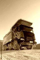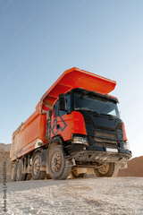 Construction dump truck on sandy terrain under blue sky