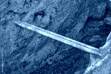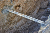 Workers are repairing utility pipes located in a deep trench at a construction site. ground is uneven, with dirt and gravel around the pipes under clear blue skies