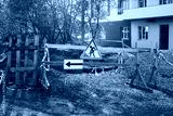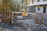 construction site is blocked off by wooden barriers and warning signs. Gravel covers the area with caution tape around the perimeter. setting is a residential street during the afternoon