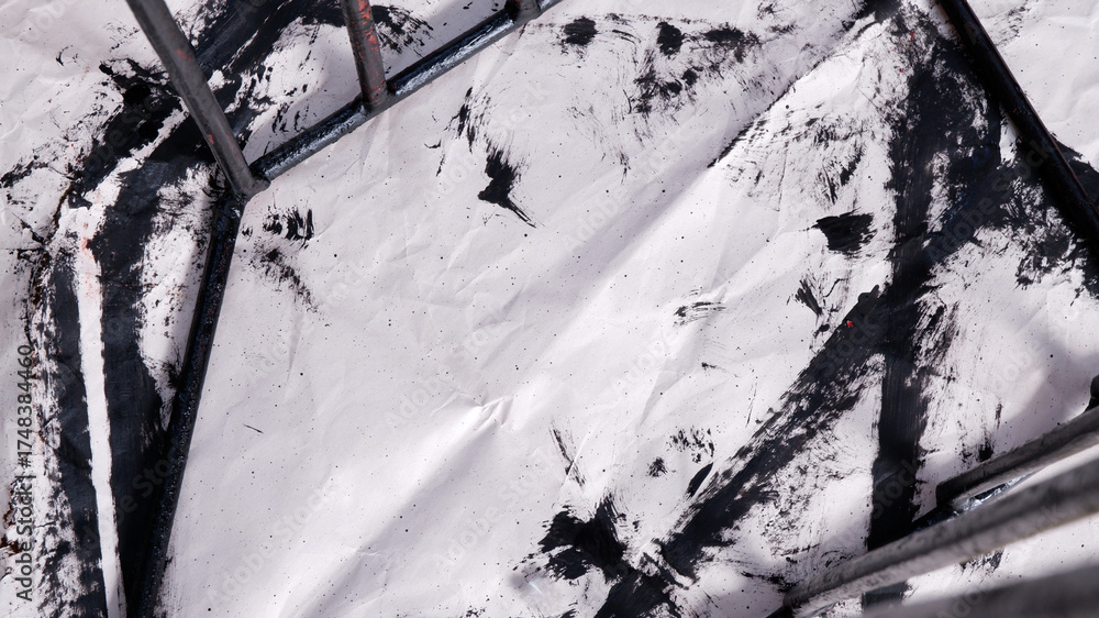 Top view of black iron and dirty ink texture on white paper background. Abstract iron painted by black ink. Concept of ink splatter, paper, steel, paint splash, dirty, work for print, web, texture.