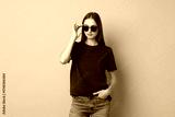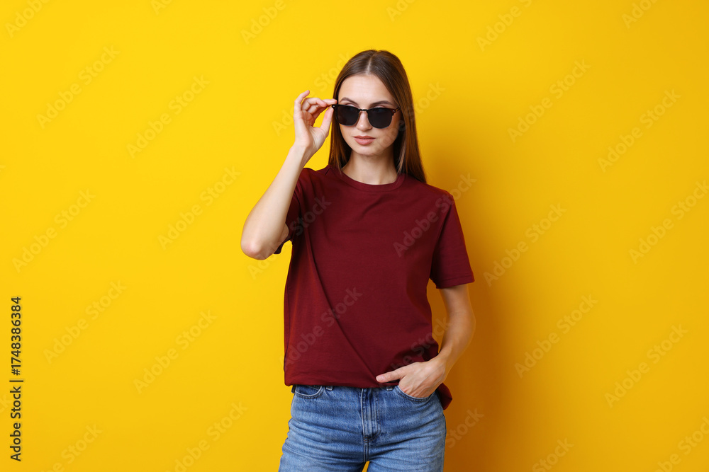 Woman wearing stylish burgundy t-shirt and sunglasses on yellow background