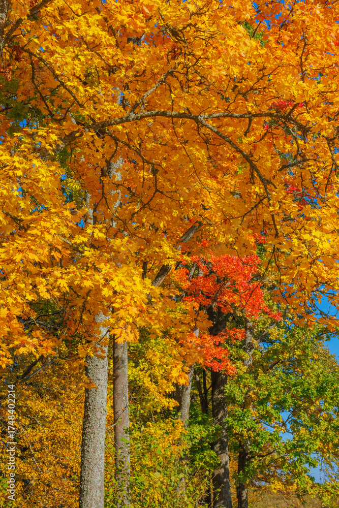 A Stunning Autumn Landscape Featuring Vibrant Trees, Bright Colors, and a Clear Blue Sky