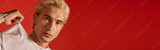 Stylish teenager posing with confidence against a vibrant red background in urban setting