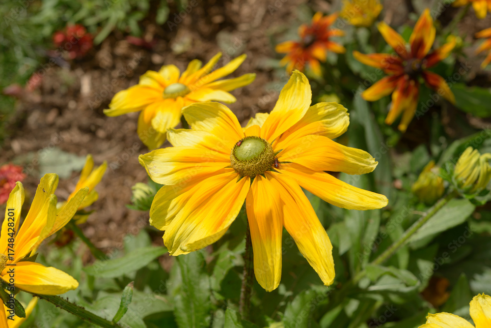 close-up of bright rudbeckia hirta or gloriosa daisy in an autumn garden