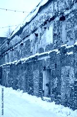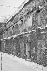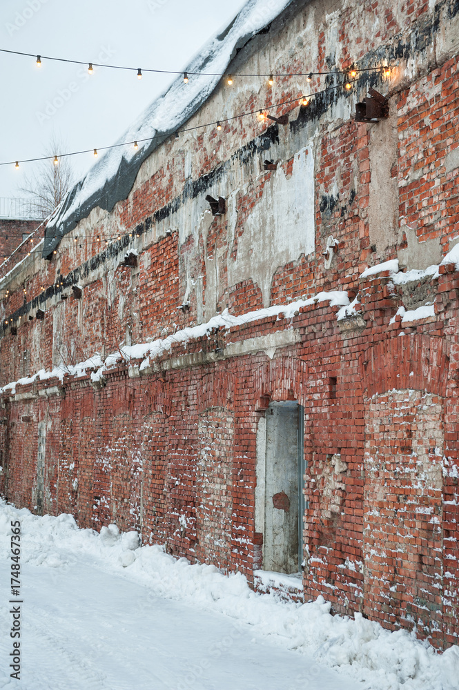 Snow-covered brick wall creates a rustic winter urban scene