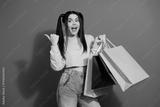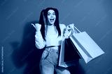 Excited young woman with shopping bags gesturing on violet background displaying joy and cheerfulness