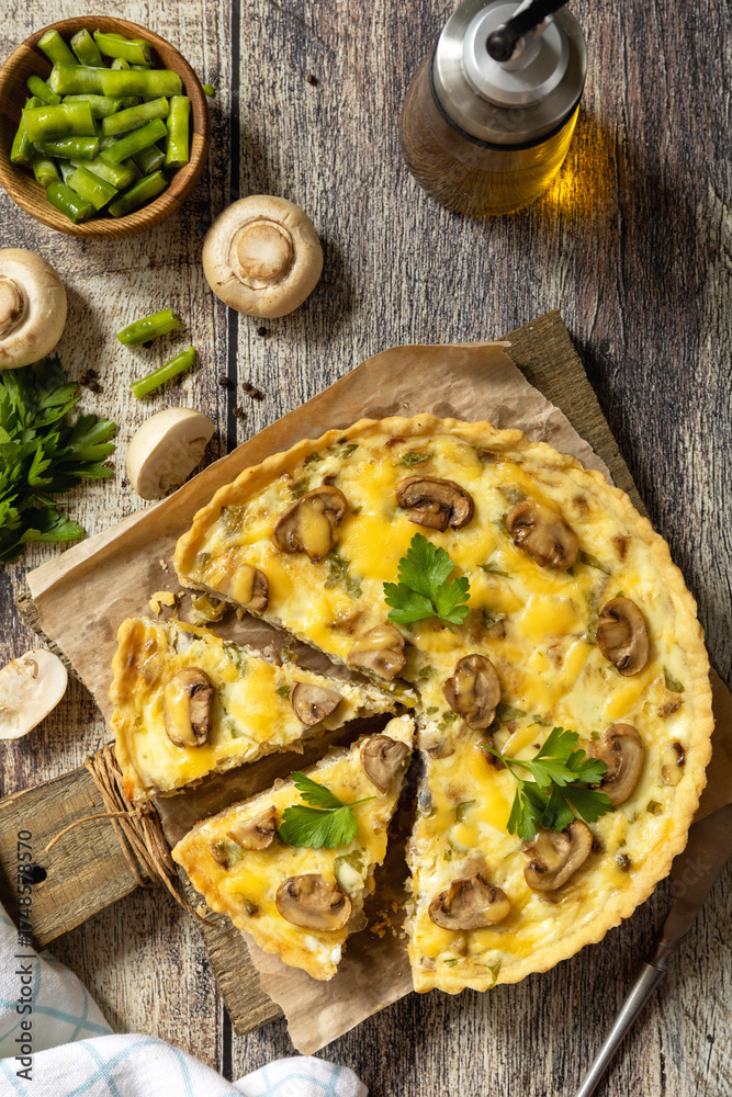 Delicious homemade mushroom quiche with mushrooms and green beans on rustic table. Top view flat lay background.