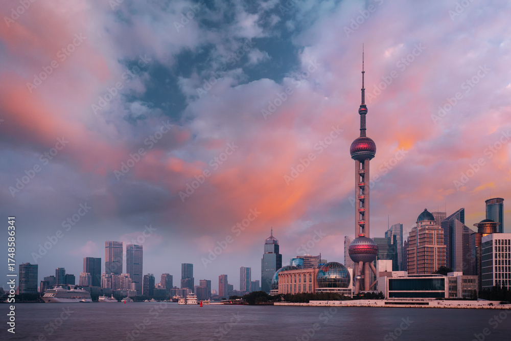 Breathtaking Shanghai Skyline at Sunset with Dramatic Colors