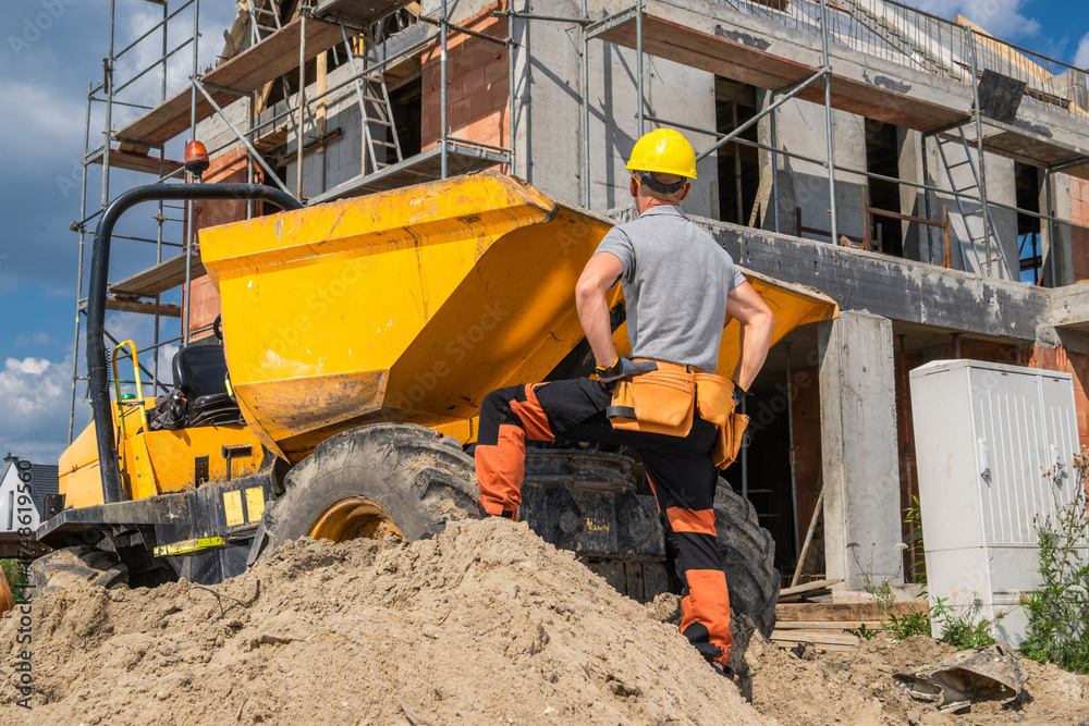 Construction Worker Operating a Dumper Truck at a Building Site on a Sunny Day