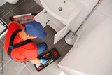 Skilled Technician Repairs Bathroom Sink While Checking Plumbing Tools