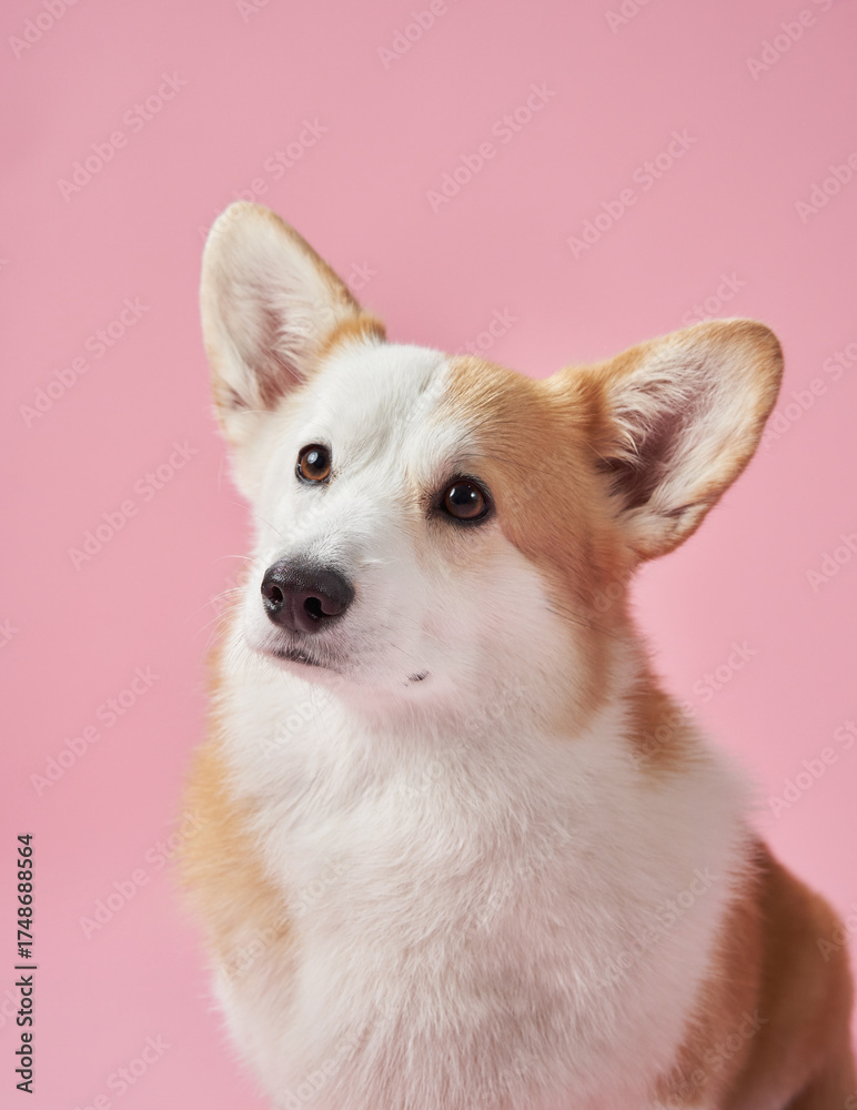 A Corgi gazes with a focused expression against a pink background, showing curiosity and alertness. The image highlights the dog attentive nature in a peaceful studio setup.