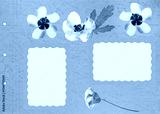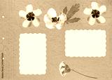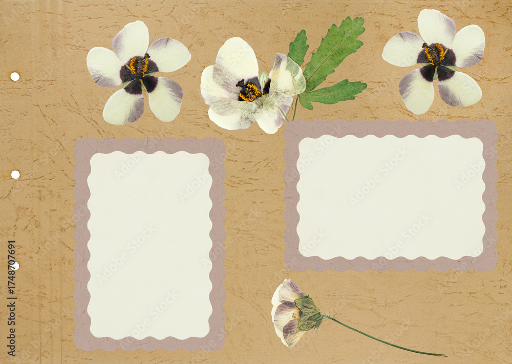 Page from photo album. Pressed and dried hibiscus flowers. Page for stories. Photo album layout with empty photo frame and dry flowers boutonniere. Scrapbook composition with floral element.