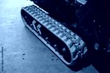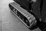 White indoor rubber track of red construction lifting machine in indoor industrial site showing industrial strength, reliability and technology used in modern engineering and heavy machinery