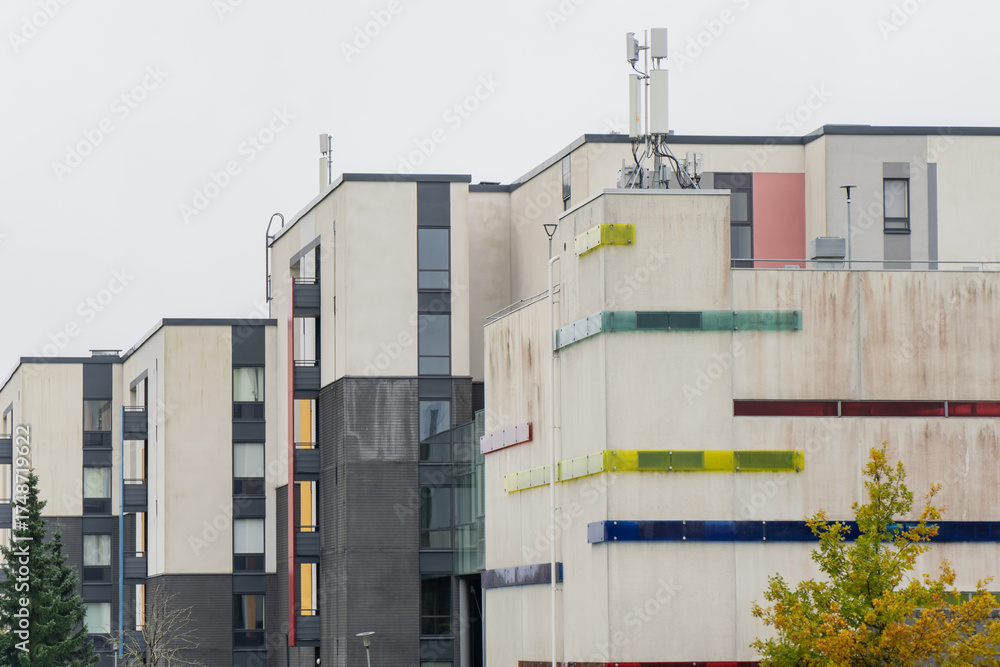 Colorful modern apartment buildings in urban residential area showing contemporary housing architecture, design creativity and city lifestyle concept