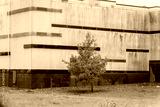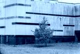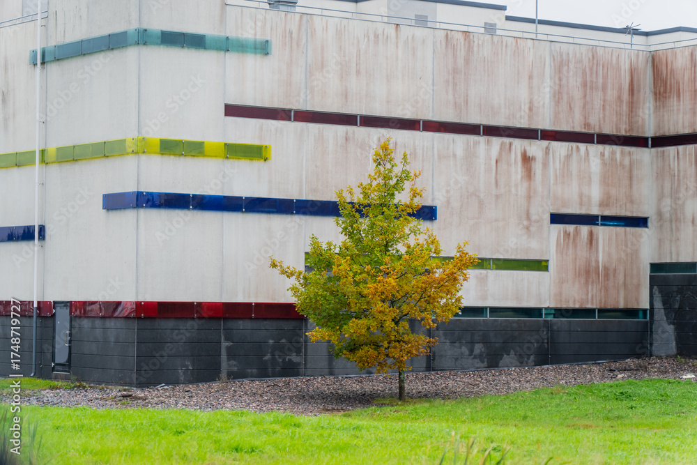 Modern concrete building with colored horizontal glass facade stripes and single autumn tree in landscaped area representing urban architecture and environmental design integration