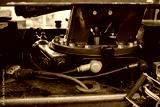 Hydraulic system with red metal parts and black hoses on industrial machine showing power, precision and technology in modern engineering equipment