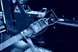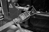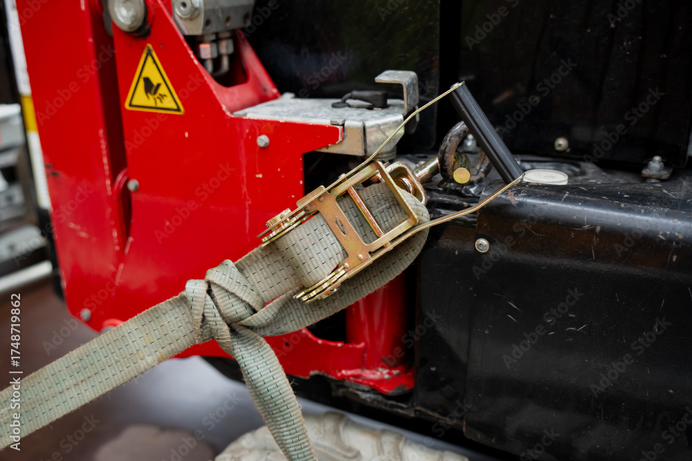 Industrial machine secured with ratchet strap showing safety, stability and reliability in heavy equipment transport and modern construction work environment